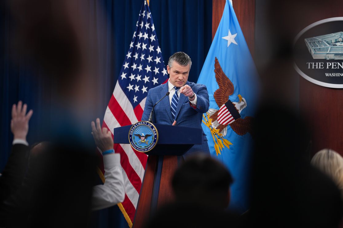 Defense Secretary Pete Hegseth takes questions at the Pentagon today. Photo: Andrew Harnik/Getty Images