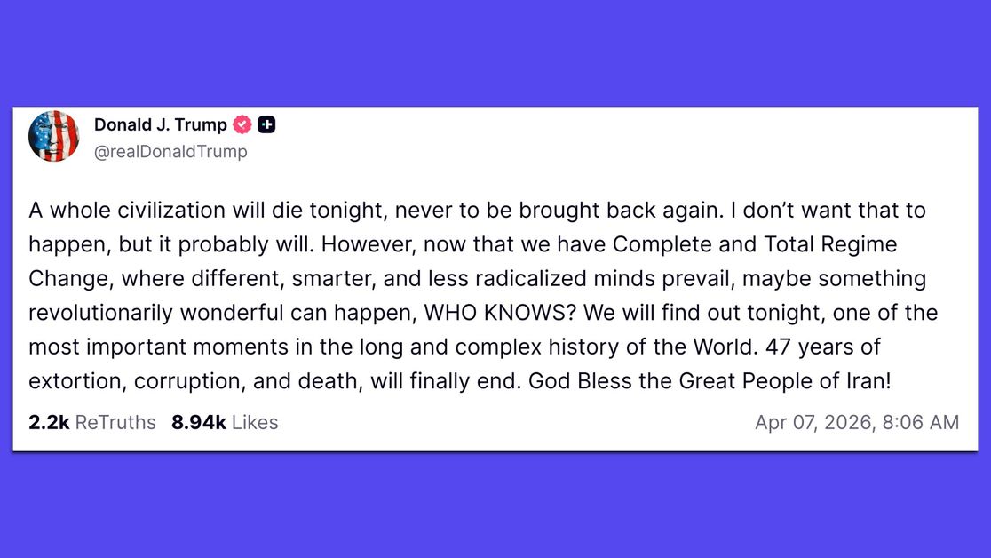 - Trump, posting on Truth Social today: "A whole civilization will die tonight, never to be brought back again. I don't want that to happen, but it probably will."